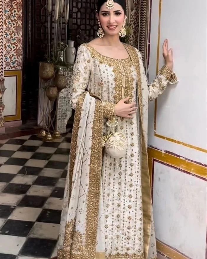 A luxury white 3-piece unstitched wedding dress with intricate embroidery, sequins, and hand embellishments. Perfect for weddings & festive occasions.