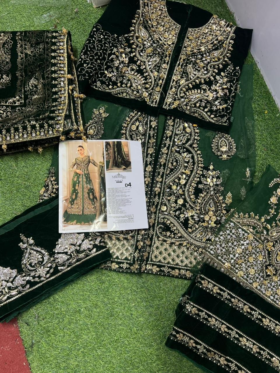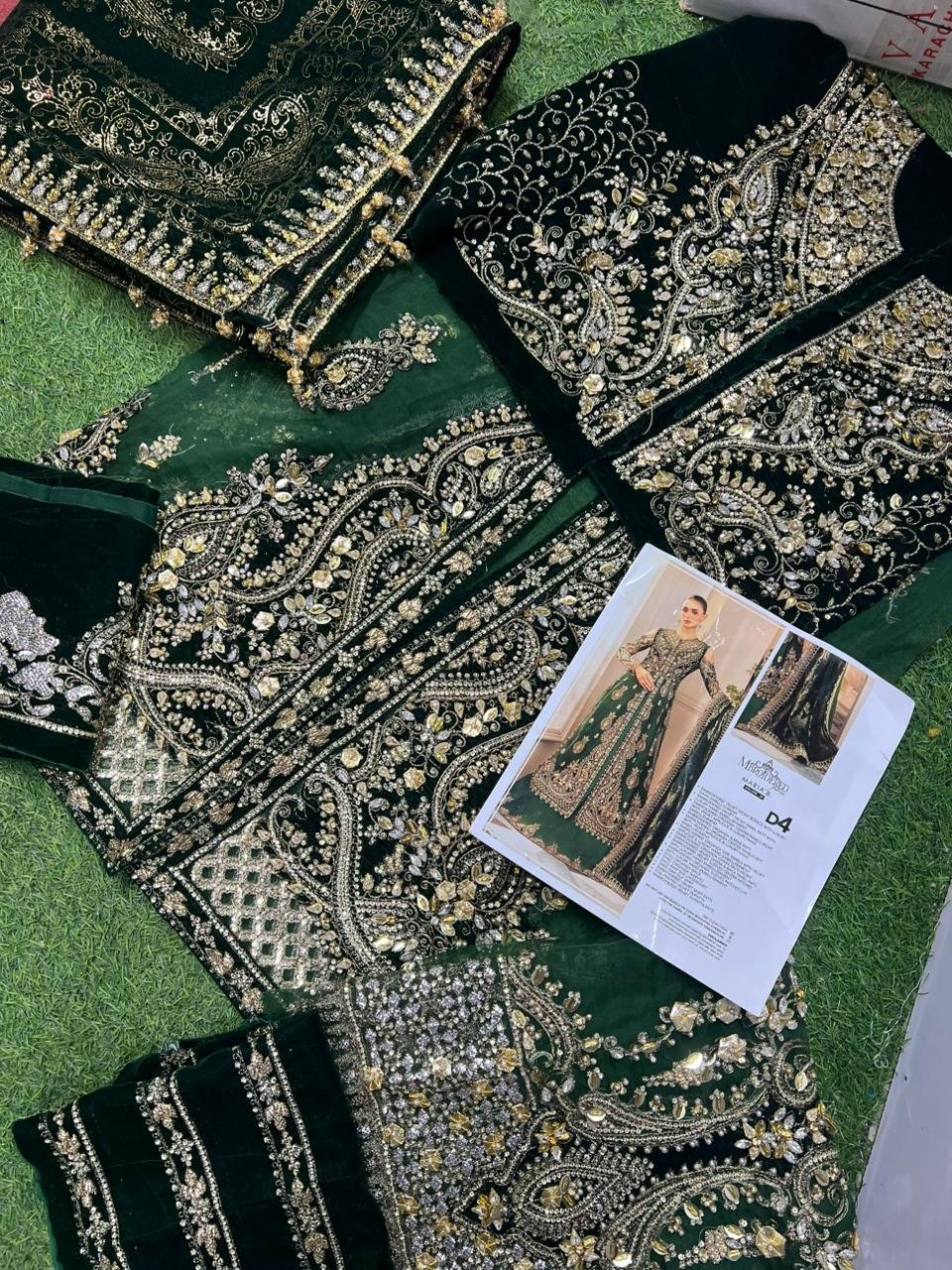 Made from premium quality organza and velvet, this dress is designed to turn heads at weddings, receptions, and formal events. The luxurious textures and detailed embellishments reflect Maria B’s signature bridal couture excellence.