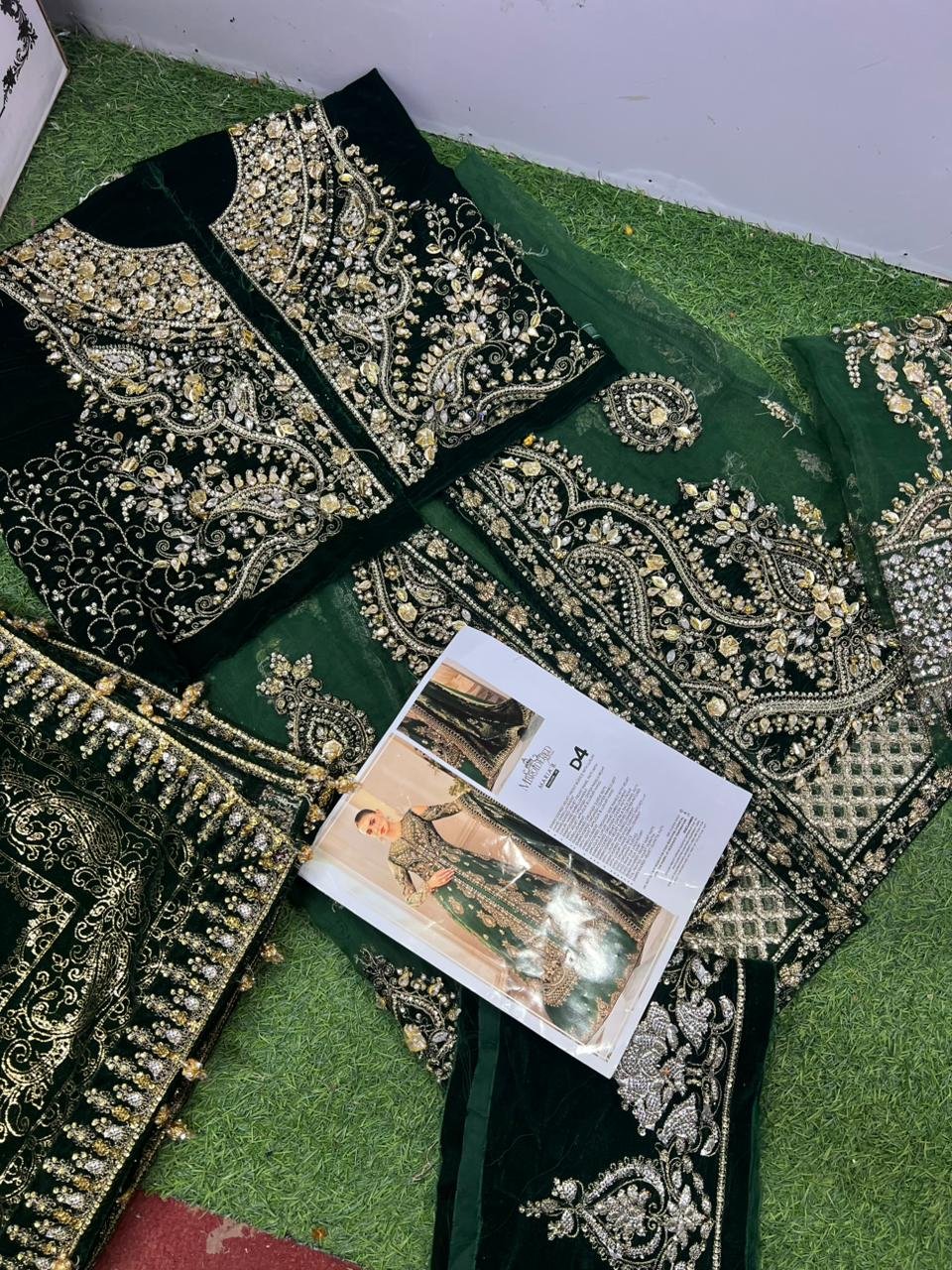- Foil Printed Velvet Dupatta: Statement velvet dupatta with foil print completes the luxurious ensemble.